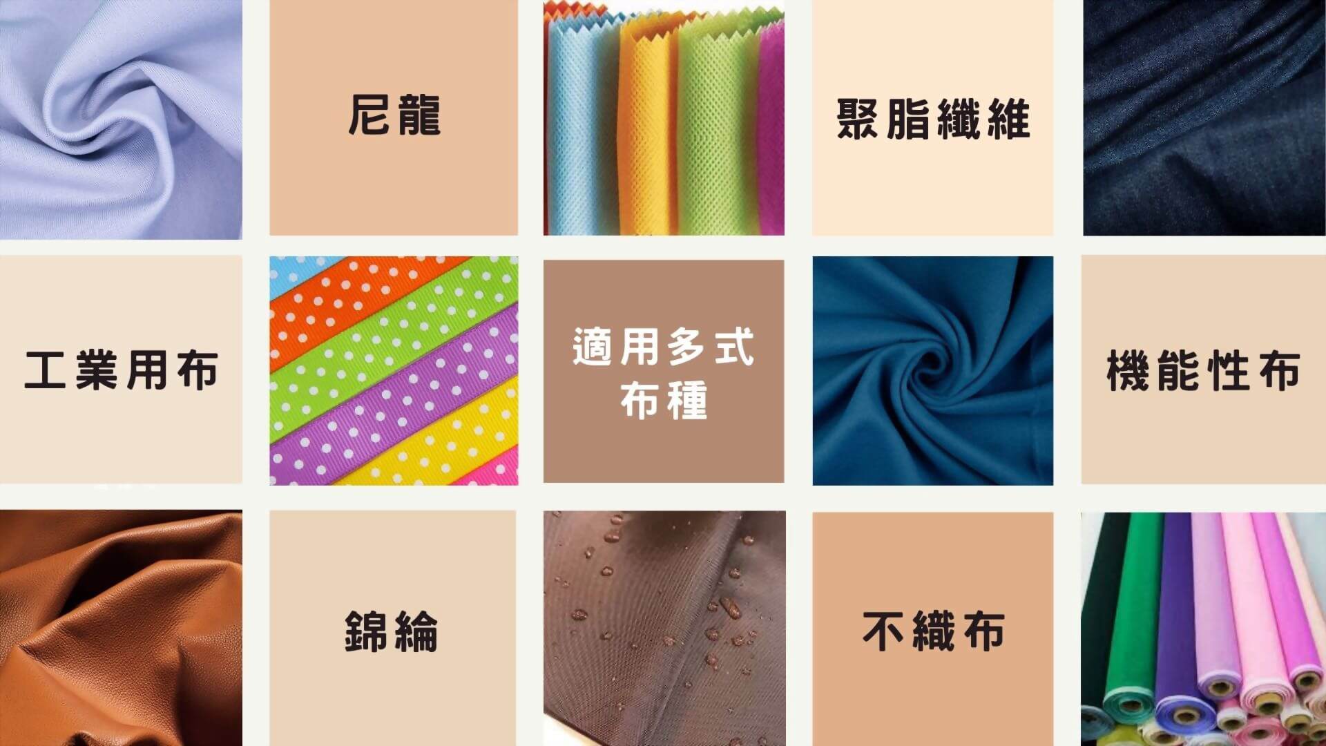 ◆應用產品:不織布、尼龍、聚酯纖維、錦綸、機能性布、褲料布、工業用布、條紋布…等各式布種